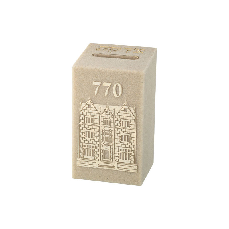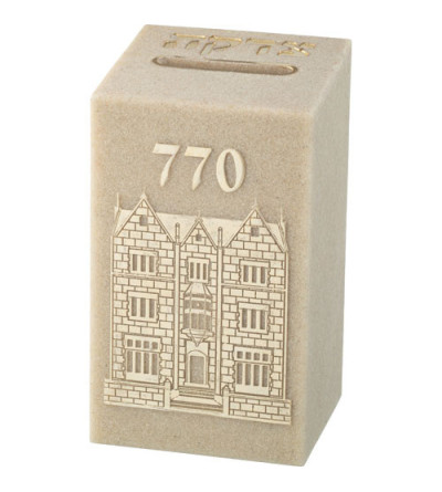 Contribuez avec style grâce à cette boîte à Tsedaka en polymère de 14×8 cm, décorée de la Maison du Rabbi de Loubavitch "770" et de l’inscription hébraïque "Tsedaka", alliant tradition et esthétisme.