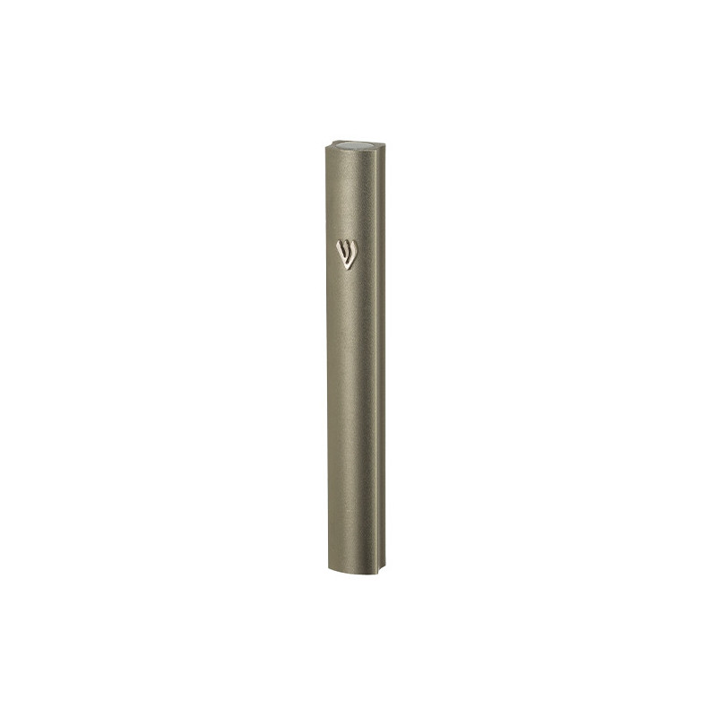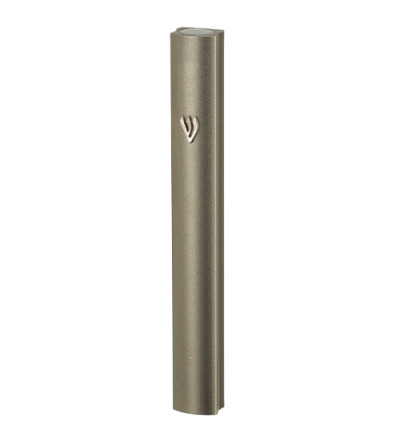 Élégant boîtier de Mézouza en aluminium coloris champagne, orné d’une lettre Shin (ש) métallique.