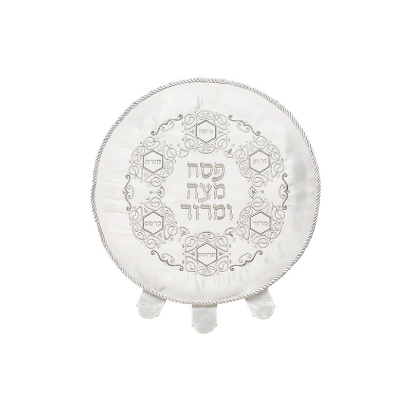 Couvre matsot de Pessa’h en satin, conçu avec trois compartiments distincts pour une organisation claire du rituel. De couleur blanche, il est sublimé par une broderie argentée avec les inscriptions en hébreu Pessa’h, Matsa et Maror. Les motifs brodés représentant le blé et les aliments symboliques du plateau du Seder renforcent la dimension spirituelle de l’objet. Un couvre matsot élégant et lumineux pour une table de fête soignée.