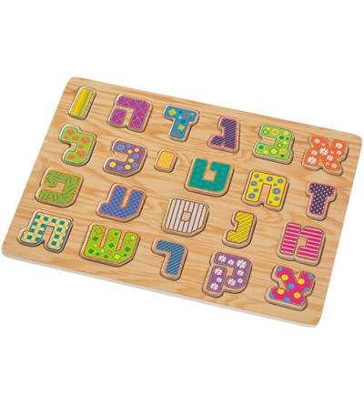 Puzzle en bois coloré représentant les lettres de l’alphabet hébreu (Aleph-Bet), avec des illustrations ludiques pour faciliter l’apprentissage des enfants.