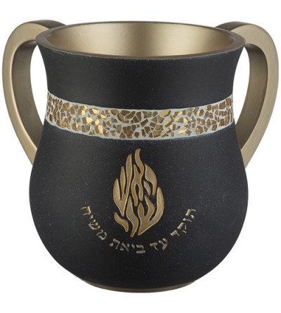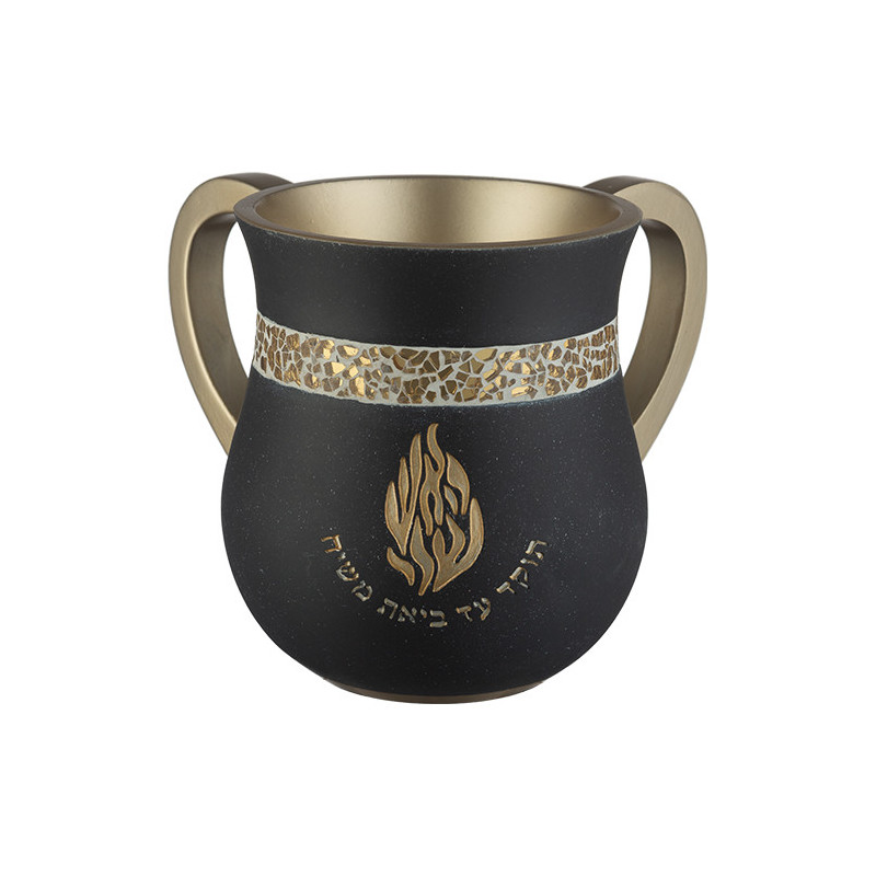Ce Keli de Netilat Yadayim en polyresin noir, orné d’une flamme Breslev et d’anses dorées, allie force spirituelle et élégance contemporaine. Son design raffiné avec éclats dorés illumine chaque rituel d’ablution. Un accessoire symbolique et esthétique pour votre quotidien.