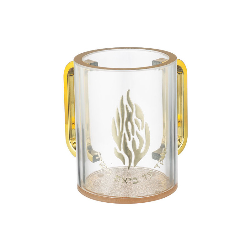 Ce Keli de Netilat Yadayim en acrylique transparent de 13 cm marie avec raffinement transparence, dorure et symbolisme. La flamme Breslev dorée, symbole d’élévation spirituelle, apporte une touche de lumière et de profondeur à ce récipient d’ablution.