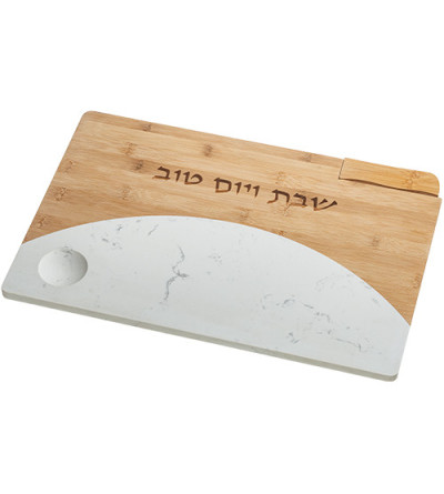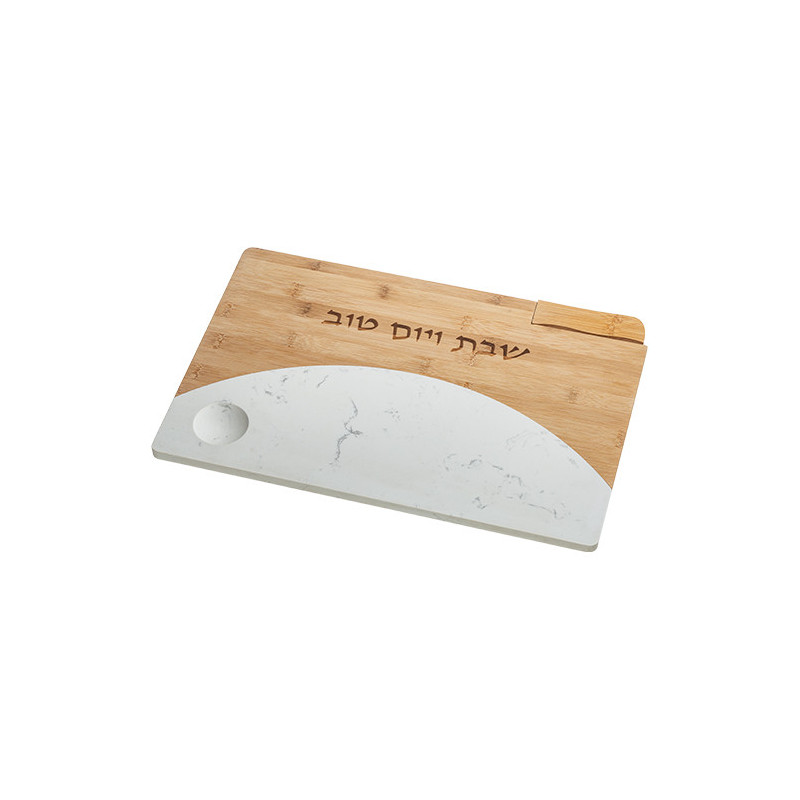 Plateau à pain de Chabbat en bois et marbre 30×45 cm, livré avec un couteau assorti. Conçu pour mettre en valeur les hallot, il combine la chaleur du bois et la noblesse du marbre pour un service stable et élégant lors du Chabbat et du Yom Tov.