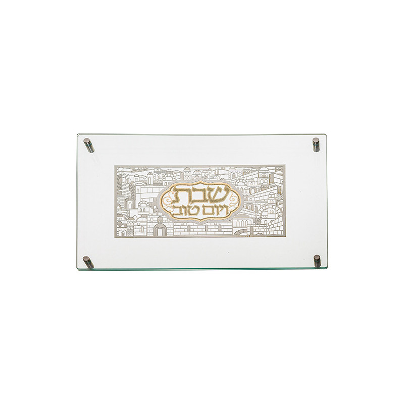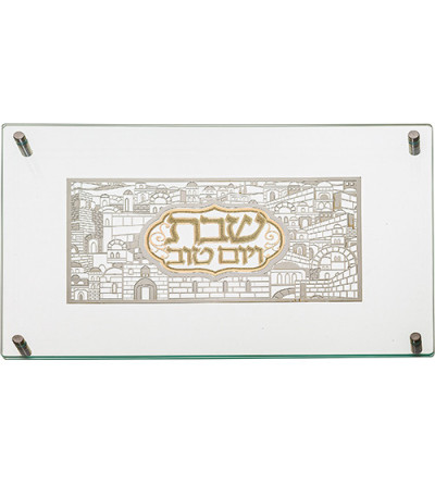 Sublimez votre table de Chabbat et de Yom Tov avec ce plateau à pain en verre sur pieds, orné d’une élégante plaque argentée représentant Jérusalem et d’inscriptions dorées « Chabbat » et « Yom Tov ». Un accessoire raffiné mêlant tradition et modernité.