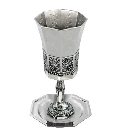 Ce verre de Kiddouch en métal avec une superbe finition nickel illustre le thème des fleuves bibliques, symboles d’abondance et de bénédiction.